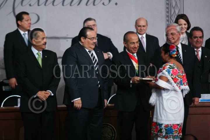 MÉXICO, D.F., 05FEBRERO2011.- Manlio Fabio Beltrones, presidente de la mesa directiva del Senado, Jorge Carlos Ramírez, presidente de la Cámara de Diputados, Felipe Calderón Hinojosa, presidente de los Estados Unidos Mexicanos y Juan N. Silva Meza, presidente de la Suprema Corte Justicia de la Nación, entregaron constituciones mexicanas en diferentes dialectos esto en la ceremonia conmemorativa del 94 aniversario de la promulgación de la Constitución Política de los Estados Unidos Mexicanos de 1917 en el Palacio Nacional. FOTO: RODOLFO ÁNGULO/CUARTOSCURO.COM