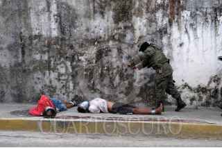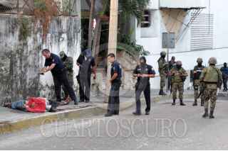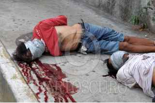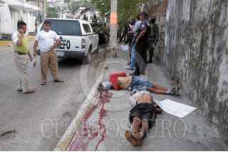 ACAPULCO, GUERRERO, 05FEBRERO2011.- A las 7:05 horas una llamada anónima reportó dos hombres muertos sobre la Calle El Morro, del Fraccionamiento Condesa a unos 15 metros de la Avenida Costera Miguel Alemán. Los hombres estaban amordazados del cuello a la frente con cinta canela; atados de los pies y las manos hacia atrás con cinta industrial; ambos con disparos en cabeza y cuello. "Esto les va a pasar a todos los que trabajen y apoyen a los extorsionadores y rateros C.I.D.A., Melón, Coreano, Padrino, Eden, Atte. Arre con la que barre", decía en una cartulina que dejaron cerca de los cuerpos. En el lugar fueron encontraron 6 casquillos percutidos calibre .9 milímetros. Las autoridades ministeriales desconocen la identidad de los individuos así como el móvil de la ejecución y los posibles responsables. Los cuerpos fueron trasladados al servicio medico forense FOTO: BERNANDINO HERNÁNDEZ/CUARTOSCURO.COM