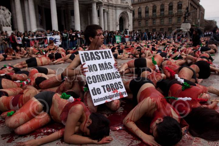 MÉXICO, D.F., 06FEBRERO2011.- Activistas de la organización ambientalista AnimaNaturalis se manifestaron semidesnudos y banderillados frente al Palacio de Bellas Artes formando la palabra BASTA para exigir al gobierno la abolición de la tauromaquia. FOTO: IVÁN STEPHENS/CUARTOSCURO.COM