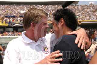 México, D. F. 13 Junio 2004.- Hans Westerhoff, director técnico de las chivas del Guadalajara y Hugo Sáchez director técnico de los Pumas se saludan previo al partido final del torneo de Clausura 2004. FOTO: Moisés Pablo/CUARTOSCURO.COM