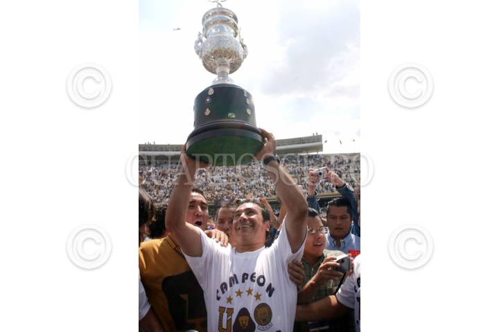 México, D.F., 13JUNIO2004.- Sergio Bernal, capitán de los Pumas, levanta la copa del campeonato del Torneo de Clausura 2004 junto con el equipo, los universitarios se fueron hasta la instancia de los penales, sin embargo lograron coronarse en el estadio Olimpico del 68. FOTO: Moisés Pablo/CUARTOSCURO.COM