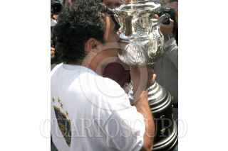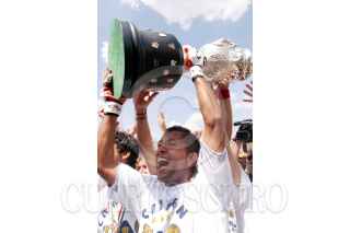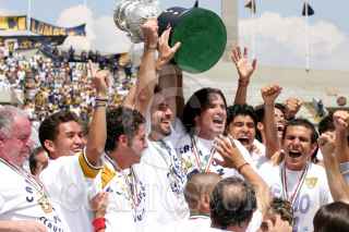 México, D.F., 13JUNIO2004.- Sergio Bernal, capitán de los Pumas, levanta la copa del campeonato del Torneo de Clausura 2004 junto con el equipo, los universitarios se fueron hasta la instancia de los penales, sin embargo lograron coronarse en el estadio Olimpico del 68. FOTO: Moisés Pablo/CUARTOSCURO.COM