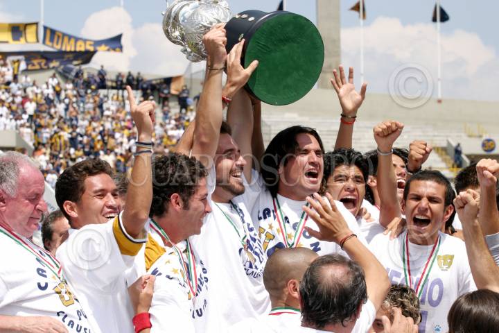 México, D.F., 13JUNIO2004.- Sergio Bernal, capitán de los Pumas, levanta la copa del campeonato del Torneo de Clausura 2004 junto con el equipo, los universitarios se fueron hasta la instancia de los penales, sin embargo lograron coronarse en el estadio Olimpico del 68. FOTO: Moisés Pablo/CUARTOSCURO.COM