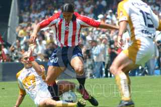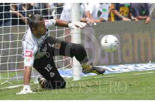 MÉXICO, D.F. 13JUNIO2004.- Sergio Bernal, arquero de Pumas, trata de impedir que entre el balón en la portería de su equipo. FOTO: Moisés Pablo/CUARTOSCURO.COM