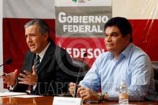 CULIACAN, SINALOA, 10FEBRERO2011.- Heriberto Felix Guerra, titular de SEDESO junto a Mario Lopez Valdez, Gobernador del estado durante la conferencia donde informaron que se ofrecerá apoyos a jornaleros que no tengan trabajo mediante el Programa de Empleo Temporal Permanente del Gobierno federal. FOTO: RASHIDE FRIAS/CUARTOSCURO.COM
