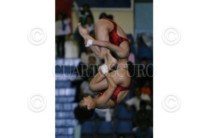 México, D. F. 20 Junio 2004.- Las clavadista mexicanas Paola Espinoza y Jashia Luna ejecutan un clavados en la final de 10 metros sincronizados del Grand Pirx de clavados, donde obtuviernon el segundo lugar. FOTO: Nelly Salas/CUARTOSCURO.COM