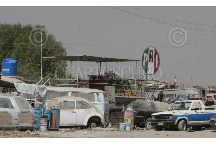 NEZAHUALCOYOTL, ESTADO DE MÉXICO, 16FEBRERO2011.- Un logotipo del PRI resalta entre carros viejos en un predio del Bordo de Xochiaca. FOTO: SAÚL LÓPEZ/CUARTOSCURO.COM