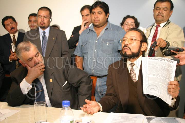 México, D.F. 23 JUNIO 2004.- José Luis Soberanes, presidente de la CNDH y Adrian Ramírez López, investigador de la UNAM y padre de dos mujeres que fueron encarceladas y maltratadas despuès de los hechos ocurridos en Guadalaja en la III Cumbre de América Latina. FOTO: Sandra Perdomo/CUARTOSCURO.COM