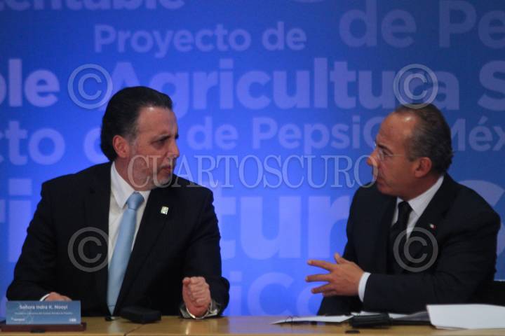 MÉXICO, D.F., 22FEBRERO2011.- Felipe Calderón, Presidente de México, durante la firma de convenios entre PepsiCo y el Banco Internacional de Desarrollo. FOTO: ENRIQUE ORDÓÑEZ/CUARTOSCURO.COM