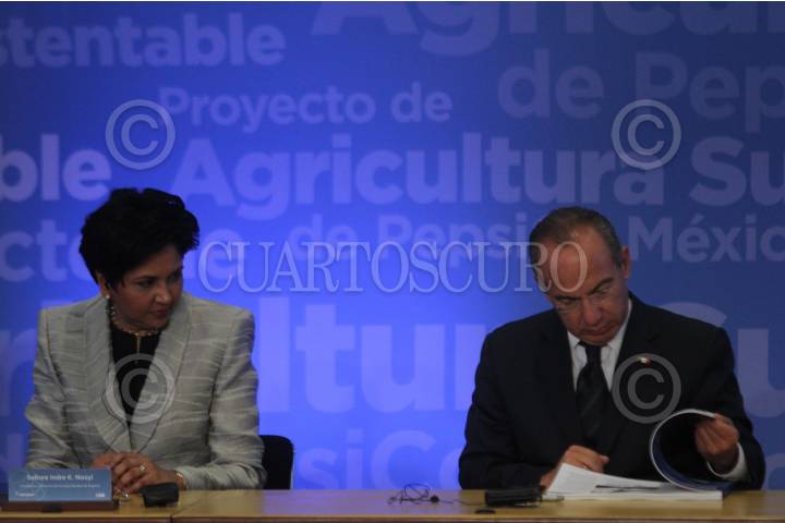 MÉXICO, D.F., 22FEBRERO2011.- Felipe Calderón, Presidente de México, durante la firma de convenios entre PepsiCo y el Banco Internacional de Desarrollo. FOTO: ENRIQUE ORDÓÑEZ/CUARTOSCURO.COM