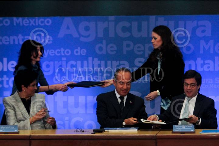 MÉXICO, D.F., 22FEBRERO2011.- Felipe Calderón, Presidente de México, durante la firma de convenios entre PepsiCo y el Banco Internacional de Desarrollo. FOTO: ENRIQUE ORDÓÑEZ/CUARTOSCURO.COM