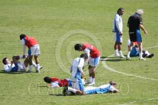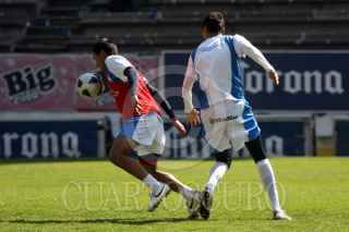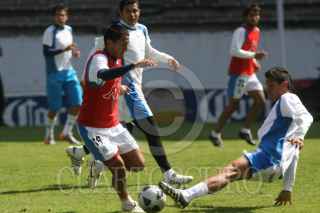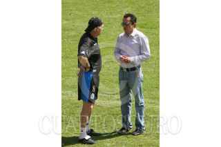 PUEBLA, PUEBLA, 22FEBRERO2011.- Héctor Hugo Eugui, director técnico del Puebla y el directivo, Jesús López Chargoy, conversan durante el entrenamiento de la Franja en el estadio Cuauhtémoc. FOTO: FRANCISCO GUASCO/CUARTOSCURO.COM