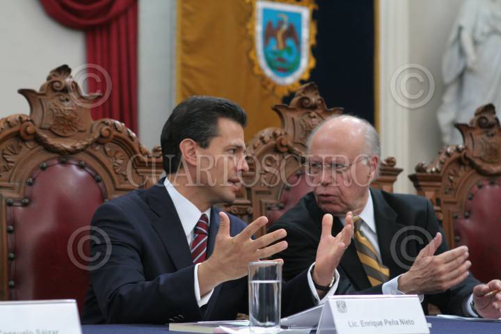 MÉXICO, D.F, 23FEBRERO2011.- Enrique Peña Nieto, gobernador del Estado de México, José Narro Robles, rector de la Universidad Nacional Autónoma de México y Eduardo Gasca Pliego, rector de la Universidad Autónoma del Estado de México, recorrieron el pasillo dedicado a estado mexiquense en la Feria Internacional del Libro del Palacio de Minería. FOTO: MOISÉS PABLO/CUARTOSCURO.COM