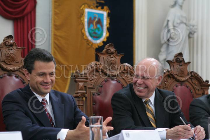 MÉXICO, D.F, 23FEBRERO2011.- Enrique Peña Nieto, gobernador del Estado de México, José Narro Robles, rector de la Universidad Nacional Autónoma de México y Eduardo Gasca Pliego, rector de la Universidad Autónoma del Estado de México, recorrieron el pasillo dedicado a estado mexiquense en la Feria Internacional del Libro del Palacio de Minería. FOTO: MOISÉS PABLO/CUARTOSCURO.COM