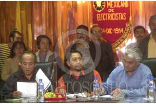 MEXDF25JUNIO2004.- Antonio Almazan, secretario del trabajo de la SME, Moises Flores y Carlos Rodriguez Canchola integrantes de la organización de trabajadores de la industria petrolera ofrecieron una conferencia de prensa en donde dieron su postura sobre la marcha en contra de la violencia que se realizará el próximo 27 de Junio. FOTO: Eunice Adorno/CUARTOSCURO.COM