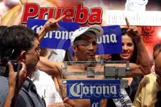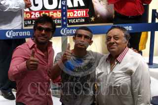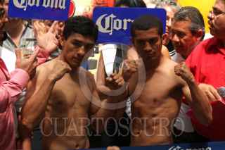 MERIDA, YUCATÁN, 25FEBRERO2011.- Gilberto Keb Baas y Antonio el "Jaguar" Aguirre libraron la báscula en la ceremonia de pesaje, previa a la "Prueba de Fuego" combate en el que el yucateco defenderá por primera ocasión su centro minimosca del Consejo Mundial de Boxeo. FOTO: FRANCISCO BALDERAS/CUARTOSCURO.COM