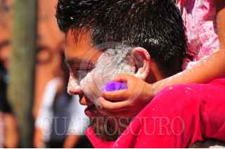 AJIJIC, JALISCO, 27FEBRERO2011.- Bajo un cielo despejado, empezó este domingo y seguirá por otros tres, el desfile de la tradicional Zayaca que se realiza en el pueblo de Ajijic coincidiendo con la festividad próxima del carnaval. Esta costumbre viene de la época colonial cuando los indígenas se burlaban de las vestimentas de los españoles y en la temporada del carnaval para no incurrir en castigos recorrían las calles, echándole harinas y confeti en las caras a la gente. FOTO:MARIA DI PAOLA BLUM/CUARTOSCURO.COM