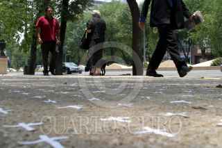 México, D.F. 04 JULIO 2004.- Algunos creadores se reunieron a las afueras de la embajada de Estados Unidos para manifestar su repudio a las acciones belicas de dicho país, y realizaron una exposición llamada "creadores en guerra, contra la guerra". En memoria de los muertos tapizaron un tramo de la banqueta de Av. Reforma con cruces. FOTO: Sandra Perdomo/CUARTOSCURO.COM