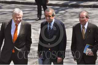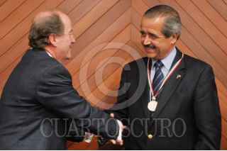 MÉXICO, D.F., 04MARZO2011.- Jesús Agustín Velasco y José Ángel Córdova Villalobos, secretario de Salud, este último recibió la medalla a la excelencia en bioética, en reconocimiento por su compromiso y vocación por difundir esta ciencia, en el marco del lanzamiento de la convocatoria al premio internacional "Manuel Velasco Suárez" a la excelencia bioetica. FOTO: EDUARDO MORALES/CUARTOSCURO.COM