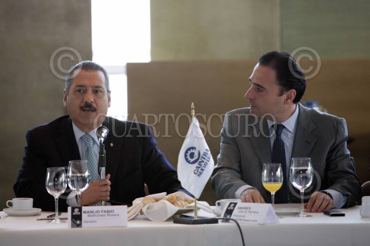 NUEVO LEON, MONTERREY, 07MARZO2011.- Manlio Fabio Beltrones, presidente de la Mesa Directiva del Senado y Andres Garza Herrera, presidente de la Cámara de la Industria de la Transformación de Nuevo León (CAINTRA), durante una reunión que mantuvo el senador con miembros de la Cámara del estado. FOTO: CUARTOSCURO.COM