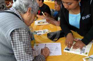 México, D.F. 06 JULIO 2004.- Una señora de la tercera edad otorga su firma en apoyo de Andrés Manuel López Obrador. Las firmas son recolectadas en las mesas receptoras instaladas en el zócalo capitalino. FOTO: Sandra Perdomo/CUARTOSCURO.COM