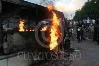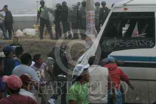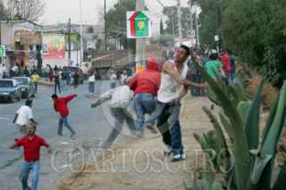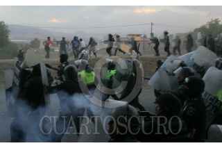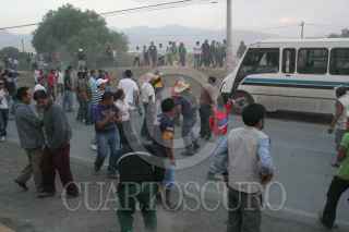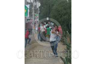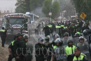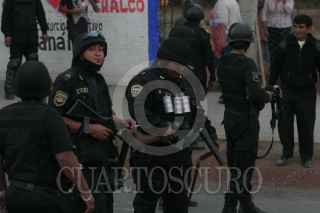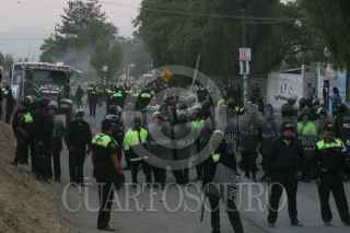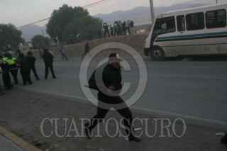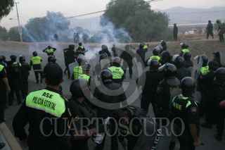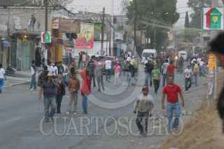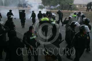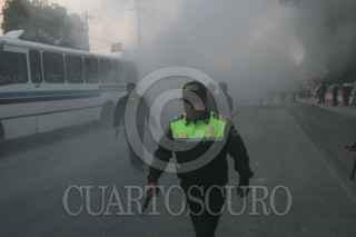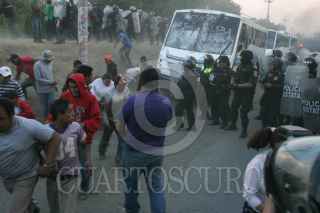 IXTAPALUCA, ESTADO DE MÉXICO, 09MARZO2011.- Un segundo enfrentamiento se registró entre habitantes de San Francisco y elementos de la ASE, después que los pobladores pretendían quemar cinco camiones que tenían retenidos, los policías antimotines utilizaron gas lacrimógeno para dispersar a la turba. Dichos enfrentamientos se registraron, después que la mañana de hoy, dos personas perdieran la vida al ser atropellados por un chofer que viajaba a exceso de velocidad. FOTO: SAÚL LÓPEZ/CUARTOSCURO.COM