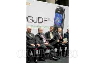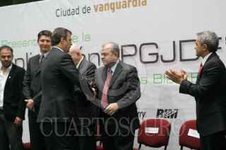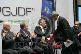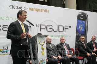 MÉXICO, D.F., 10MARZO2011.- Marcelo Ebrrad Casaubón, Jefe de Gobierno, se despide del presidente del Tribunal Superior de Justicia del DF Edgar Elías Azar, al finalizar la presentación de la aplicación para BlackBerry que permite a los usuarios utilizar el MP Virtual para presentar denuncias por delitos como fraude o robo sin violencia FOTO: MOISÉS PABLO/CUARTOSCURO.COM