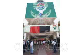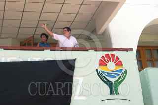 CANCUN QUINTANA ROO08JULIO2004.- El alcalde Juan Ignacio Gacía Zalvidea, se asomo por breves minutos al balcon del palacio municipal de Benito Juárez donde lleva dos días sin salir en compañia de sus directores, la huelga de los trabajadores sigue en espera del pago 11 regidores que aceptan renunciar a su cargo como una alternativa para solicionar el conflicto, la ingobernabilidad del municipio. FOTO: Amaranta Prieto/CUARTOSCURO.COM