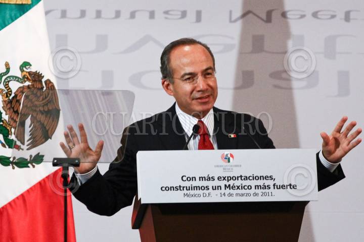MÉXICO, D.F., 14MARZO2011.- Felipe Calderón Hinojosa, presidente de México, inauguró la American Chamber of Commerce of Mexico, realizado en un conocido hotel de la Ciudad de México. FOTO: MISAEL VALTIERRA/CUARTOSCURO.COM