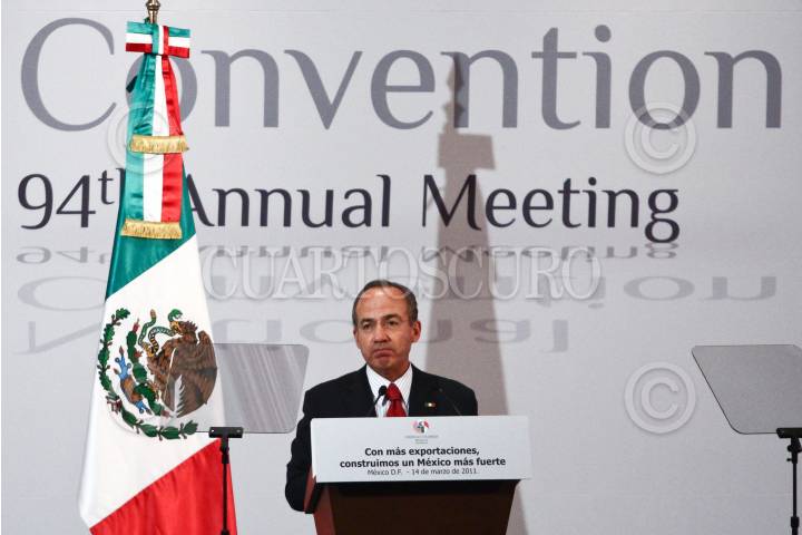 MÉXICO, D.F., 14MARZO2011.- Felipe Calderón Hinojosa, presidente de México, inauguró la American Chamber of Commerce of Mexico, realizado en un conocido hotel de la Ciudad de México. FOTO: MISAEL VALTIERRA/CUARTOSCURO.COM