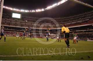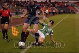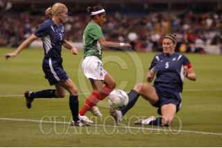 MEXDF 08JULIO2004.- En la cancha del estadio Azteca, se enfrentaron las selecciones femeniles de futbol de México y Australia en un juego amistoso de preparación para las olimpiadas. La mexicana Maribel Domínguez dispara ante l amarca de la defensa Cheryl Salisbery. FOTO: Germán Romero/CUARTOSCURO.COM