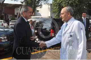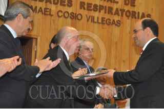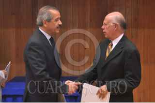 MÉXICO, D. F., 16MARZO2011.- José Ángel Cordova Villalobos, Secretario de Salud, saluda a José narro Robles, rector de la Universidad Nacional Autónoma de México (UNAM), durante la ceremonia conmemorativa del 75 aniversario del INER. FOTO: EDUARDO MORALES/CUARTOSCURO.COM