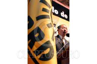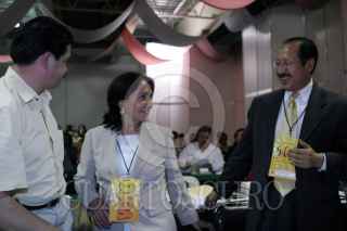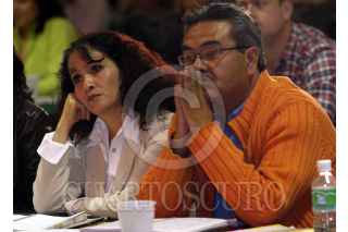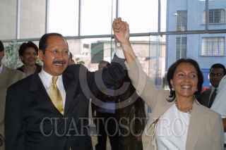 México, D.F., 09JULIO2004.- El V Consejo Nacional continuación del 16º Pleno Ordinario del PRD se realiza reuniendo a los miembros de su consejo polítco. En la imagen, Leonel Godoy, presidente del partido levanta la mano de Amalia García Medina, gobernadora electa de Zacatecas. FOTO: Brenda Magaly/CUARTOSCURO.COM