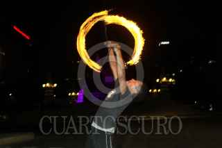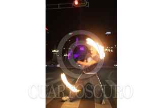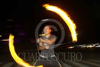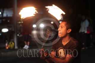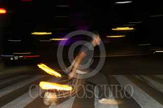 MÉXICO, D.F., 22MARZO2011.- Un artista urbano realiza su espectáculo con cadenas de fuego en avenida Reforma, esto para ganarse unos monedas y continuar con sus estudios. FOTO: MOISÉS PABLO/CUARTOSCURO.COM
