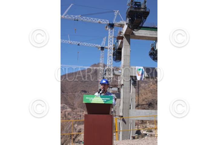LA CONCORDIA, DURANGO, 22MARZO2011.- Dionisio Pérez-Jácome, secretario de Comunicaciones y Transportes (SCT); Mario López Valdez, gobernador de Sinaloa; Felipe Calderón Hinojosa, presidente de México y Jorge Herrera Caldera, gobernador de Durango, durante un recorrido de supervisión de la construcción del puente Baluarte-Bicentenario, ubicado en el popularmente conocido "Espinazo del Diablo" perteneciente a la Sierra Madre Occidental. Ésta puente que tendrá un costo de 20 mil millones de pesos, una longitud de mil 124 metros y que unirá a los estados de Durango y Sinaloa, tiene un avance del 74 por ciento. FOTO: ALFREDO GUERRERO/CUARTOSCURO.COM