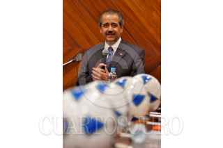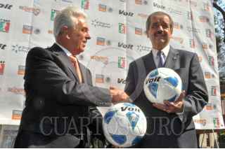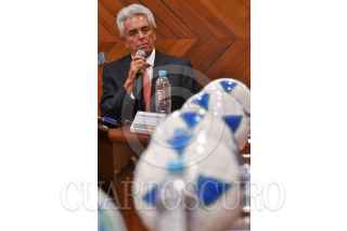 MÉXICO, D.F., 23MARZO2011.- Justino Compeán, presidente de la Federación Mexicana de Fútbol (Femexfut) y José Ángel Cordova Villalobos, secretario de Salud, durante la presentación de la campaña "Balón contra la obesidad". Ésto, para promover el ejercicio y que se jugará las jornadas 12 a 15 del Torneo de Clausura 2011 de la primera división del fútbol mexicano. FOTO: EDUARDO MORALES/CUARTOSCURO.COM