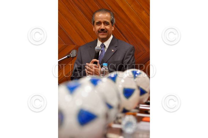 MÉXICO, D.F., 23MARZO2011.- Justino Compeán, presidente de la Federación Mexicana de Fútbol (Femexfut) y José Ángel Cordova Villalobos, secretario de Salud, durante la presentación de la campaña "Balón contra la obesidad". Ésto, para promover el ejercicio y que se jugará las jornadas 12 a 15 del Torneo de Clausura 2011 de la primera división del fútbol mexicano. FOTO: EDUARDO MORALES/CUARTOSCURO.COM