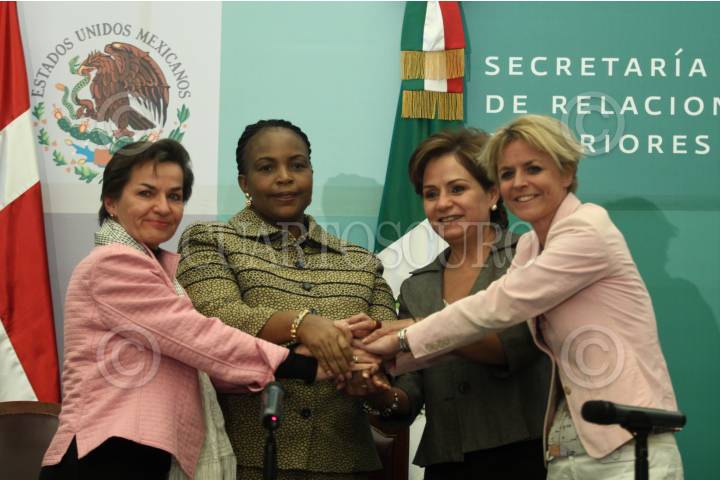 MÉXICO, D.F., 24MARZO2011.- La canciller Patricia Espinoza, secretaria de Relaciones Exteriores acompañada de Cristiana Figueres, secretaria ejecutiva de la convención marco de las Naciones Unidas sobre el Cambio Climático; Maite Nkoana-Mashabane, ministra de relaciones internacionales y cooperación de Sudáfrica de la COP17 y Lykke Friis, ministra para clima y energia de igualdad de género de Dinamarca de la COP15 durante una conferencia de prensa en la sede de la Cancilleria. FOTO: RODOLFO ANGULO/CUARTOSCURO.COM