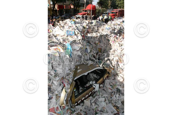 MÉXICO, D.F., 24MARZO2011.- Un trailer que transportaba papel volcó y sepultó un taxi al momento que circulaban sobre la calzada Azcapotzalco La Villa casi con el cruce Granjas en la delegación Azcapotzalco. Bomberos de la ciudad, rescataron al chofer que resultó ileso. FOTO: SAÚL LÓPEZ/CUARTOSCURO.COM