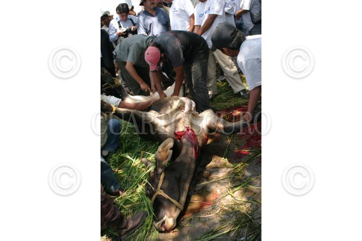 Mexico, D.F., 21JULIO2004.- Integrantes del Frente Popular Francisco Villa, sacrificaron a una res enfrente de la SAGARPA, en protesta a incumplimiento del proyecto denominado Adquisicion de Ganado de Bovino de Doble Proposito, firmado entre autoridades de la Sagarpa y el FPFV. FOTO: Moises Pablo/CUARTOSCURO.COM