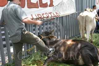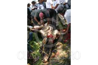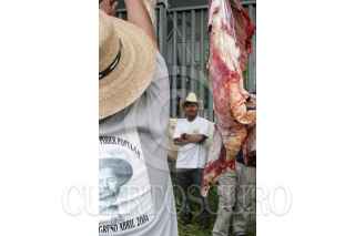 Mexico, D.F., 21JULIO2004.- Integrantes del Frente Popular Francisco Villa, sacrificaron a una res enfrente de la SAGARPA, en protesta a incumplimiento del proyecto denominado Adquisicion de Ganado de Bovino de Doble Proposito, firmado entre autoridades de la Sagarpa y el FPFV. FOTO: Moises Pablo/CUARTOSCURO.COM