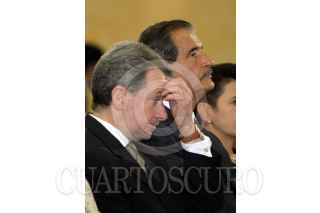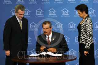 México, D.F. 21 JULIO 2004.- El presidente Vicente Fox firmó el libro de honor de la CONAPO acompañado de Santiago creel y Elena Zuñiga Herrrera, secretaria general del Consejo Nacional de Población. FOTO: Sandra Perdomo/CUARTOSCURO.COM
