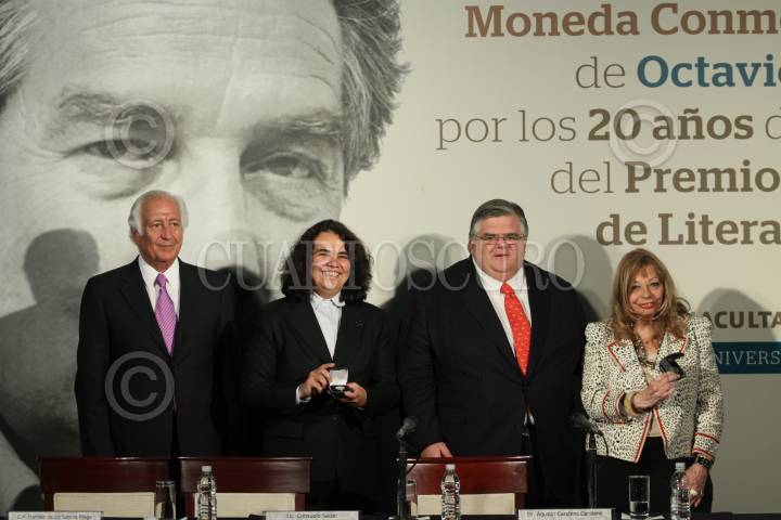 MÉXICO, D.F., 31MARZO2011.- Marcelo de los Santos Fraga, director general de la Casa de Moneda y Consuelo Sáizar, presidenta del Consejo Nacional para la Cultura y las Artes (CONACULTA), durante la presentación de la moneda de veinte pesos que conmemora su valor en años la entrega del Premio Nobel de la Paz a Octavio Paz (1914-1998), la ceremonia se realizó en la sede central del Banco de México. FOTO: MOISÉS PABLO/CUARTOSCURO.COM