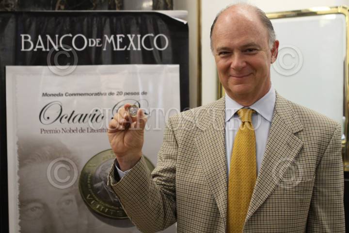 MÉXICO, D.F., 31MARZO2011.- Marcelo de los Santos Fraga, director general de la Casa de Moneda y Consuelo Sáizar, presidenta del Consejo Nacional para la Cultura y las Artes (CONACULTA), durante la presentación de la moneda de veinte pesos que conmemora su valor en años la entrega del Premio Nobel de la Paz a Octavio Paz (1914-1998), la ceremonia se realizó en la sede central del Banco de México. FOTO: MOISÉS PABLO/CUARTOSCURO.COM