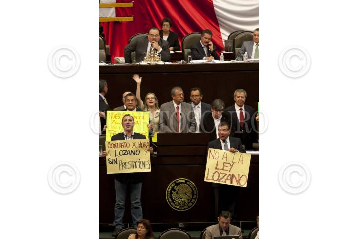 MÉXICO D.F., 31MARZO2011.- Diputados del PT PRD y Convergencia, protestaron con carteles alucivos a la reforma laboral, durante la sesión ordinaria en la Cámara de Diputados. FOTO: GUILLERMO PEREA/CUARTOSCURO.COM