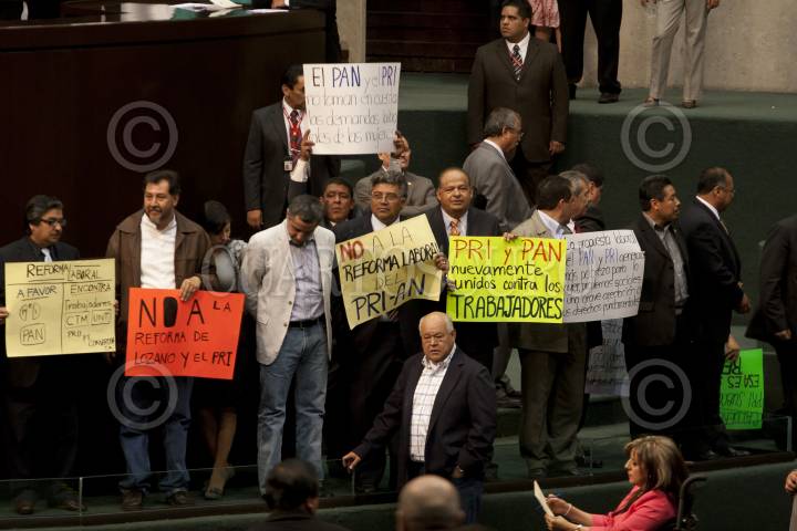 MÉXICO D.F., 31MARZO2011.- Diputados del PT PRD y Convergencia, protestaron con carteles alucivos a la reforma laboral, durante la sesión ordinaria en la Cámara de Diputados. FOTO: GUILLERMO PEREA/CUARTOSCURO.COM