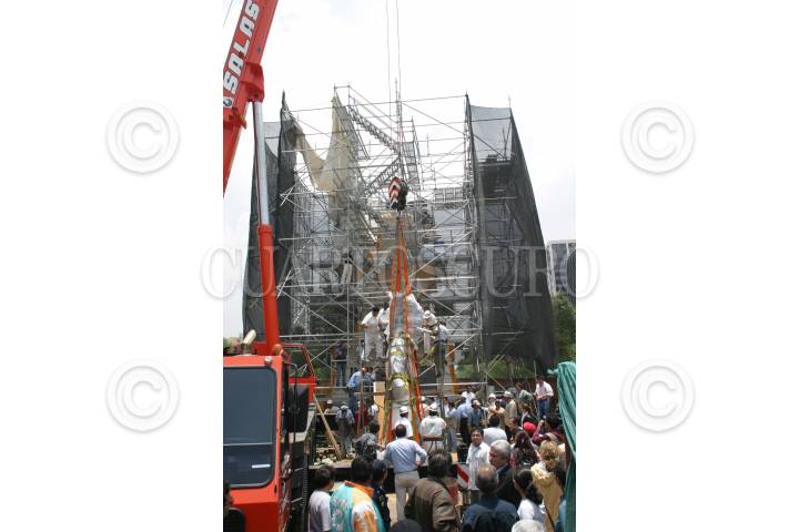 México, D. F. 23 Julio 2004.- La estatua de Cuauhtemoc es trasladada en la base de una trailer para hacia un taller para que la limpien y posteriormente llevarla a su nuevo lugar. FOTO: Nelly Salas/CUARTOSCURO.COM