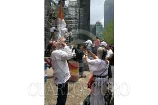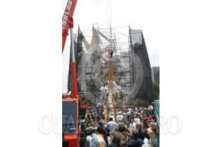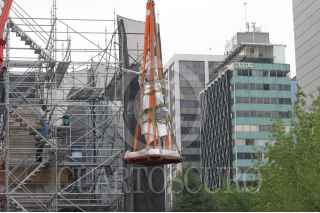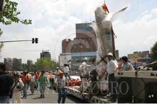México, D. F. 23 Julio 2004.- La estatua de Cuauhtemoc es trasladada en la base de una trailer para hacia un taller para que la limpien y posteriormente llevarla a su nuevo lugar. FOTO: Nelly Salas/CUARTOSCURO.COM
