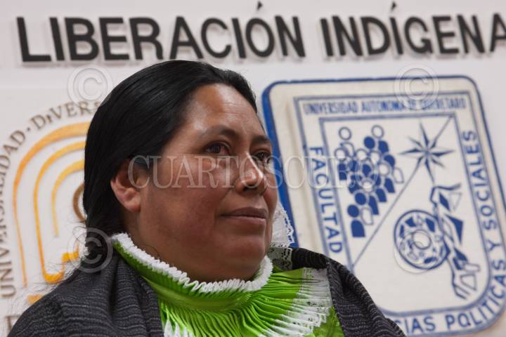 QUERÉTARO, QUERÉTARO, 01ABRIL2011.- Jacinta Francisco Marcial, indígena del municipio de Amealco, quien fuera acusada y absuelta del secuestro de 6 elementos de la AFI en 2006, inauguró la sala audiovisual dedicada al recién fallecido obispo emérito de Chiapas, Samuel Ruíz en la facultad de Filosofía de la Universidad Autónoma de Queretaro donde se lleva acabo un foro sobre teología de la liberación. Y a donde ella fue invitada a sentarse en el estrado para dirigir unas palabras. FOTO: DEMIAN CHÁVEZ/CUARTOSCURO.COM
