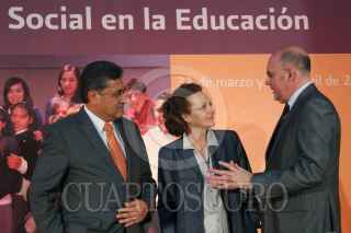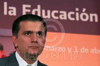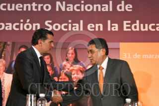 MÉXICO, D.F., 01ABRIL2011.- Alonso Lujambio Irazábal, secretario de Educación Pública, saluda a Alonso Cepeda, representante del Comité Ejecutivo Nacional del Sindicato Nacional de los Trabajadores de la Educación (SNTE), durante la clausura del VIII Encuentro Nacional de Participación Social en la Educación organizado por la SEP. Ésto se realizó en el salón Hispanoamericano de la sede de esta dependencia. FOTO: MISAEL VALTIERRA/CUARTOSCURO.COM